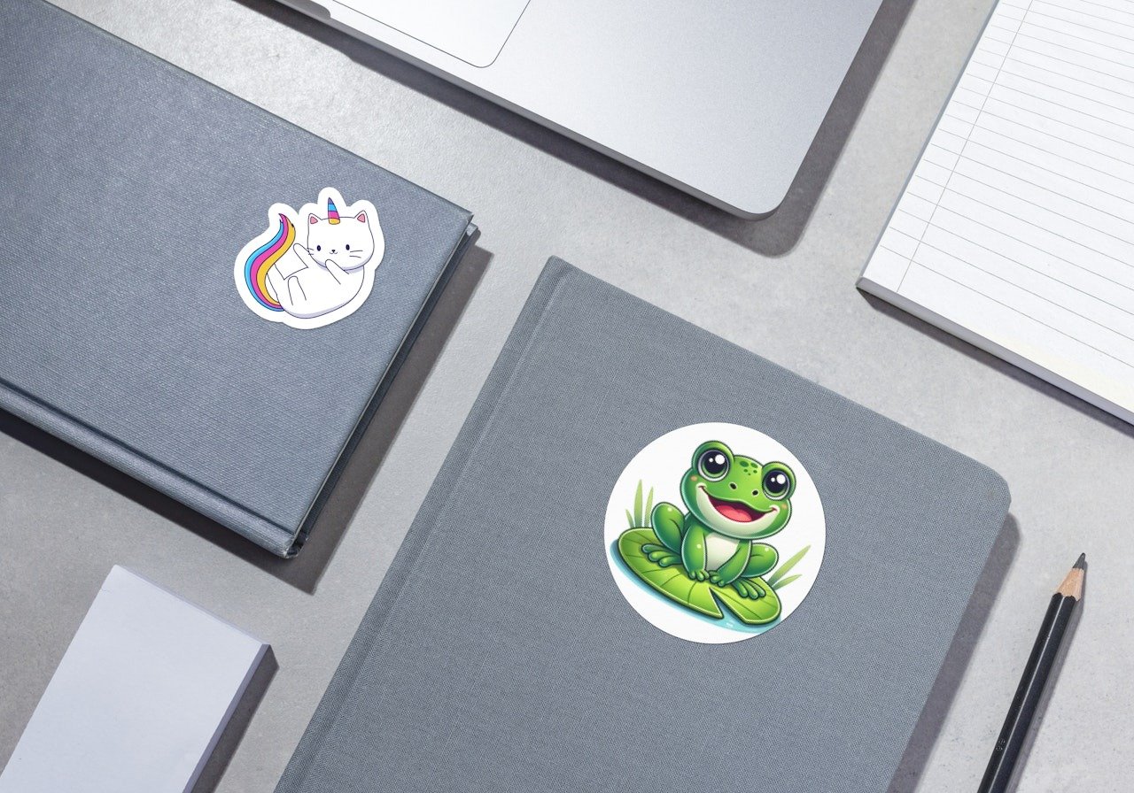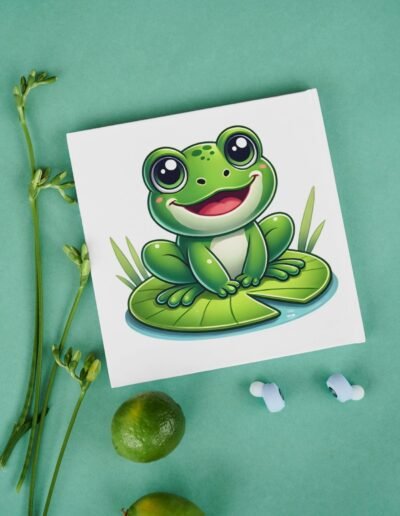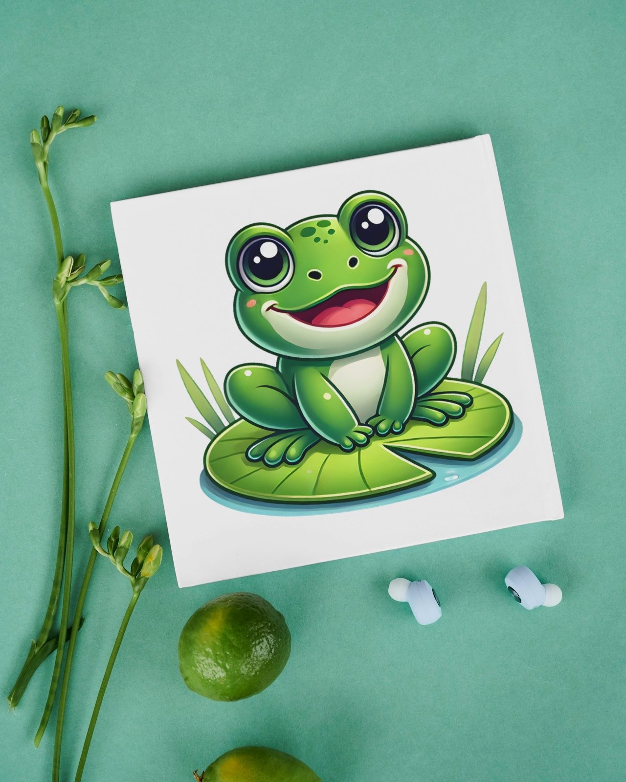 This delightful image features a cheerful green frog sitting happily on a vibrant lily pad. With its big, bright eyes and wide, joyful smile, this cute amphibian radiates positivity and charm.